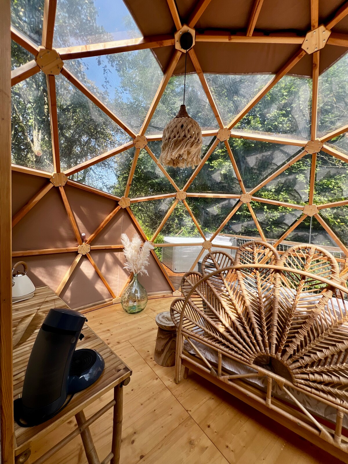 자연 한가운데 자리한 보헤미안 돔으로 떠나보세요. 시대를 초월한 휴식을 위한 따뜻한 보금자리. 킹사이즈 침대, 휴식 공간, 테라스에 마련된 전용 온수 욕조를 즐기며 숲속에서 독특한 경험을 즐겨보세요. 테라스에서 제공되는 조식(선택 사항, 1인당 15유로)과 샴페인(45유로) 한 병으로 더욱 즐거운 숙박을 즐겨보세요.