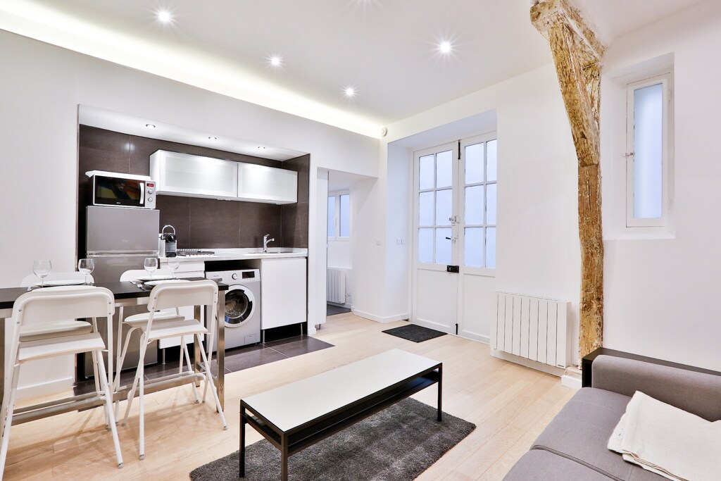 Perfectly quiet, this beautiful bright 20 m² studio offers a sweeping view of the charming neighboring church and our magnificent tree-filled courtyard. It consists of a palace-sized bed, a dining area, an open fully equipped kitchen with dishwasher and washer-dryer, and a shower room with toilet. The photos are not contractual; there are different layouts and types of furniture, all equally pleasant, which will be assigned to you depending on availability.