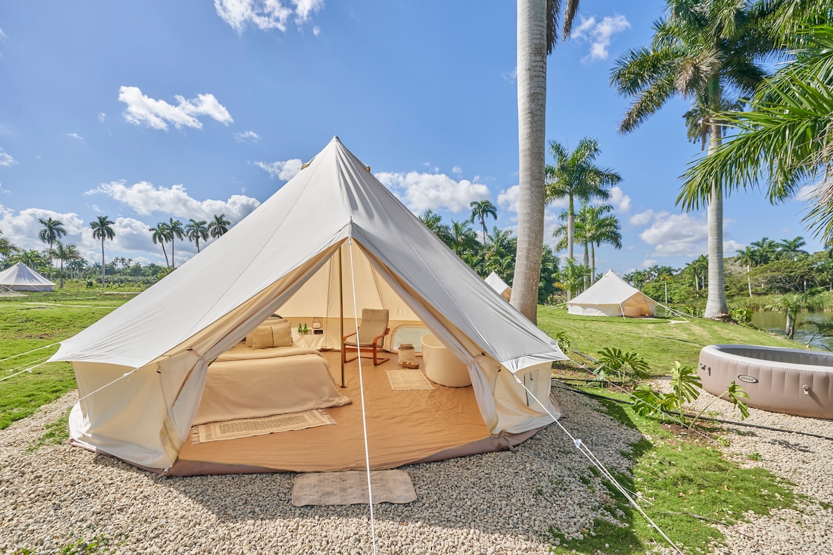 "Experience the perfect blend of luxury and nature at Hacienda El Patrón: where elegant comfort meets the tranquility of the Cuban countryside. Each tent features a spacious interior with elegant and cozy furnishings that include comfortable beds, plush seating, and tasteful decor, ensuring a relaxing stay. The attention to detail is evident with the inclusion of outdoor seating areas and bathtubs, providing a unique way to unwind in the midst of nature.