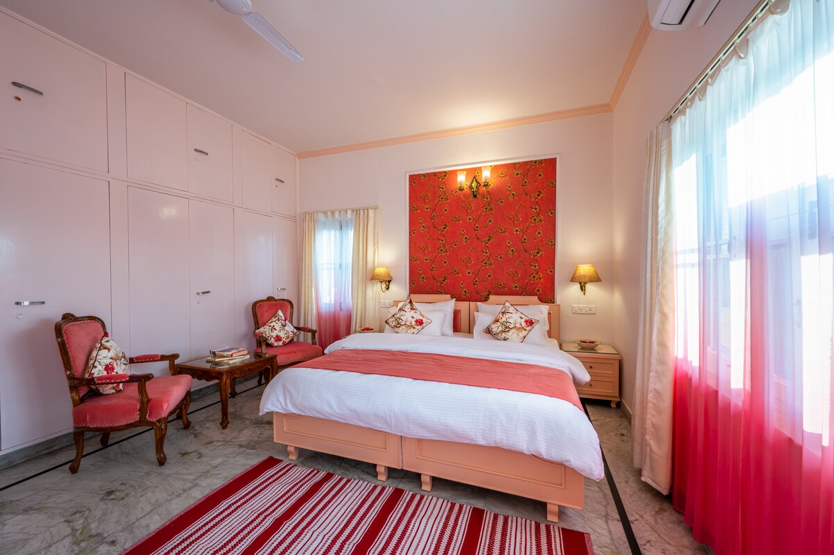 "The Golden Door" is an artistically designed room with an attached bathroom on a private terrace with panoramic views of the Aravali Hills. Ideal for couples, solo travelers, and business professionals, this accommodation seamlessly blends aesthetics and functionality. Its central location grants easy access to major attractions. In essence, "The Golden Door" transcends conventional stays. With its central location, artistic design, and comfort, it provides a simple yet unique stay.