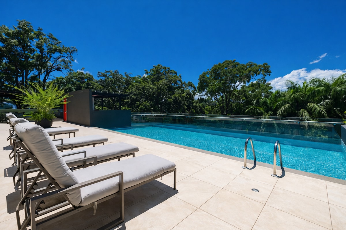 🏠 Stay in a modern and comfortable apartment in Heredia for up to 4 guests. Fully equipped 🛋️ with fiber optic internet 📶, A/C ❄️, full kitchen 🍳, private parking 🚗 and an amazing view 🌄. Just 5 min from the airport ✈️, near the Convention Center 🏢 and 4 km from Pedregal 🎪. Access to a pool 🏊♂️, gym 🏋️, movie room 🎬, coworking space 💼 and BBQ area 🍖. Perfect for remote work 💻, relaxing 😌 or exploring 🧳.