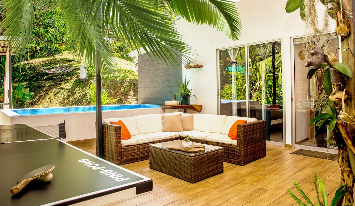 자연으로 둘러싸인 현대적인 스위트로 유명한 서핑 비치인 플라야 에르모사(자코 근처)에서 단 2분 거리에 있습니다. 침실 2개(에어컨 구비), 욕실 1개, 야외 주방/식사 공간이 있는 편안한 공간입니다. 정원 전망의 테라스에서 휴식을 취하며 매일 방문하는 흰얼굴원숭이, 마카오, 투칸을 관찰하세요. 게스트 스위트는 전용 출입구가 있는 1층에 위치하고 있지만 호스트 가족이 거주하는 숙소의 일부입니다. 울타리가 있는 정원과 주차장은 저희와 함께 사용합니다.
