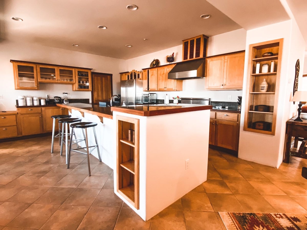 풀 럭셔리. 숨막히는 자연의 아름다움. 1,475평방피트의 카시타, 아비퀴우 호수, 유령 목장을 둘러싼 붉은 절벽, 그리고 10,000피트 높이의 페더널 산의 전망을 감상할 수 있습니다. 조지아 오키프가 그녀의 그림에서 유명하게 만들었습니다. 주방에는 스테인레스 스틸 가전제품과 무거운 게이지 그릴이 있는 보쉬 가스 스토브가 있습니다. 포털 바로 바깥에 스테인레스 바비큐가 있습니다. 마스터 BR에는 슬레이트 샤워기와 깊은 욕조가 마련되어 있습니다. 두 침실 모두 퀸사이즈 침대와 풀사이즈 팽창식 매트리스를 갖추고 있습니다.