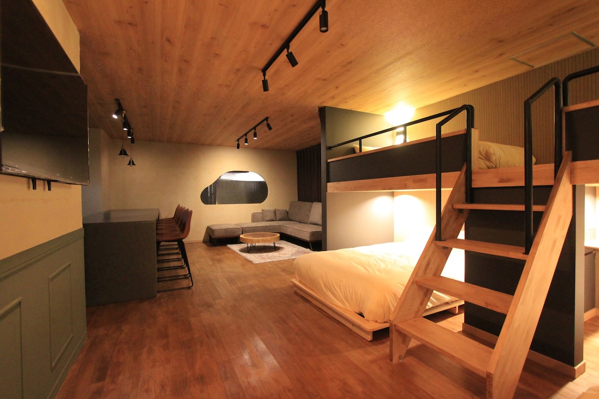 中心部の新市街まで約1km、無料駐車場完備の80㎡ワンフロアを贅沢に使えるプライベートホテルです。 キッチンには冷蔵庫、電子レンジ、調理器具など基本設備を完備。近隣には人気のラーメン店や居酒屋、カフェ、スーパーもあり、観光にも長期滞在にも便利な立地です。 ファミリーやグループ旅行に最適! 広々としたリビングスペースを確保し、家族や仲間と会話を楽しむ場所をテーマに設計。大きなダイニングカウンターやバスタブ付きの浴室で、旅の疲れも癒せます。 【お部屋の特徴】 ☆80㎡の広々空間☆ ☆20㎡以上のリビング・ダイニング・キッチン☆ ☆Bunk bed(ダブル×2、シングル×2)☆ ☆キッチン、洗濯機・乾燥機完備で快適な長期滞在☆ 【おすすめポイント】 親子旅行にも最適:お子様も安心、親御さんもリラックス 観光に便利:熊本城徒歩17分、繁華街徒歩15分 歴史ある新町エリア:レトロなカフェや地元の味を満喫