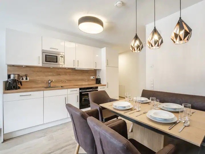 The apartment has recently been completely renovated, has a state-of-the-art interior and consists of an open space of 65 M2, which creates a very open and free feeling. The unique view over Lake Wolfgang can be enjoyed to the fullest. The luxurious bathroom including a huge bathtub, in combination with the ambient lighting, ensures ultimate relaxation. A box spring bed, a modern kitchen and a comfortable sofa ensure a perfect holiday feeling.