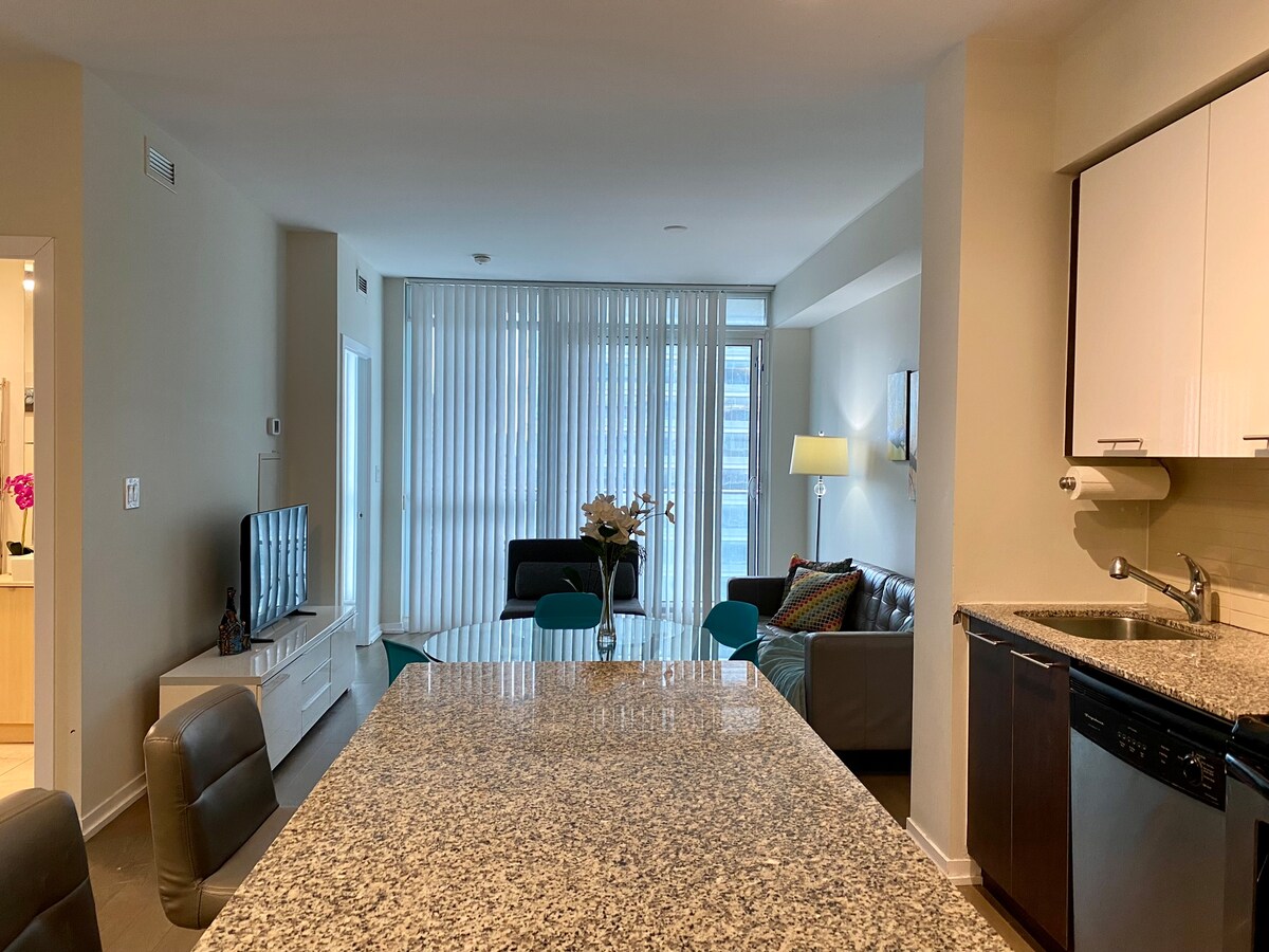 Marvel at the glorious Toronto urban vibes from your room with floor to ceiling panoramic windows. This 1 bedroom condo is professionally designed with modern finishes. You will absolutely love the space we have prepared for you. Relax, unwin,d and enjoy the city views on the private balcony with outdoor furniture. Professionally cleaned after each guest checkout. 100% private and unshared, entire modern condominium unit. Safe, secure, and easy self-check-in procedures with 24/7 security.