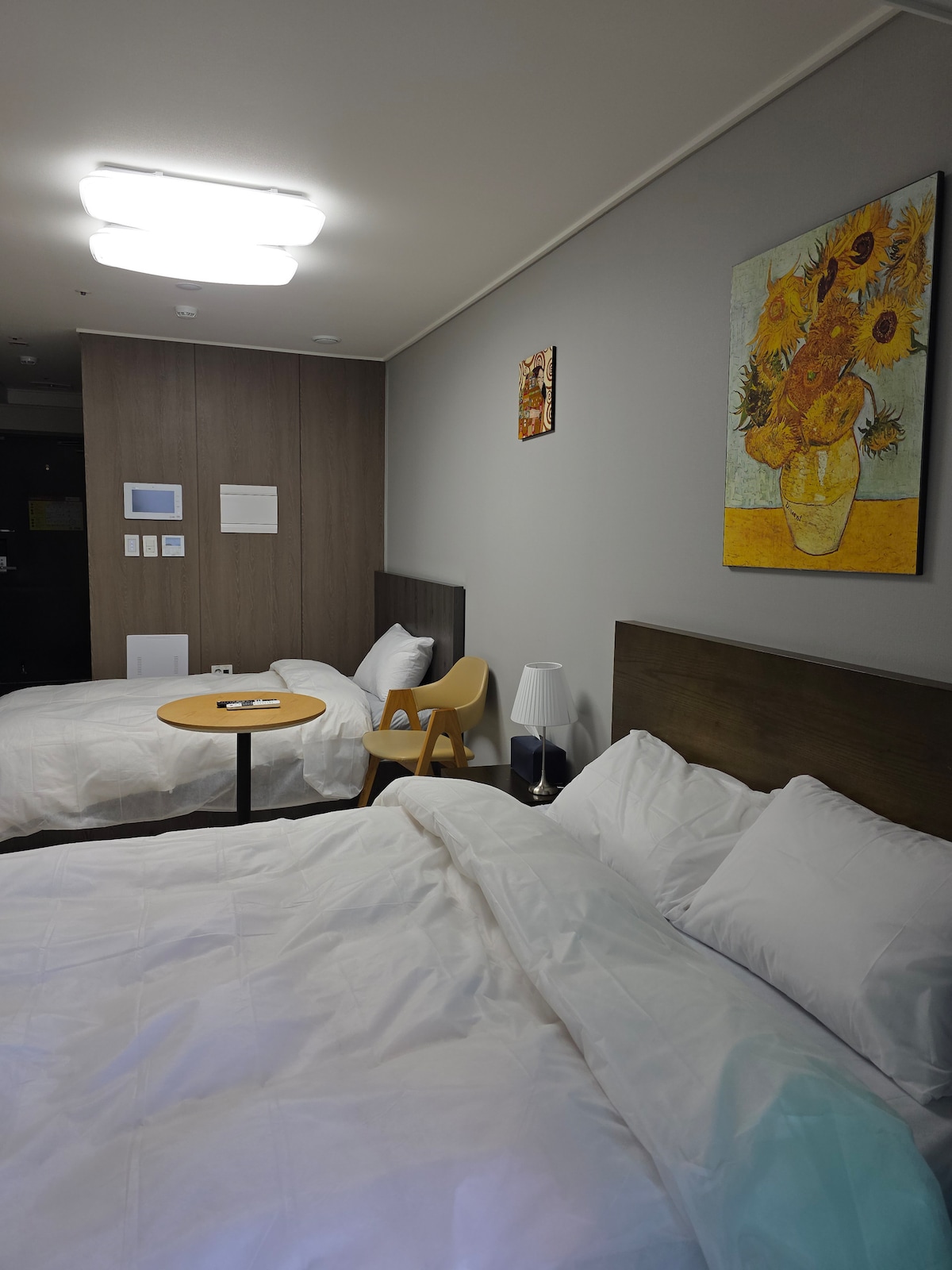 이천 안흥지 앞에 위치한 휴티스 스테이 세미 트리플룸은 가족, 친구, 출장 동료와 함께 머물기에 이상적인 신축 생활형 비즈니스 호텔입니다. 더블침대 1개와 싱글침대 1개가 마련되어 2~3인이 편안하게 이용할 수 있으며, 주방, 세탁기, 초고속 와이파이 등 생활숙박에 필요한 모든 시설이 완비되어 있습니다. 55인치 스마트TV와 넷플릭스 구독 서비스도 제공되어 언제든 여유로운 시간을 즐길 수 있습니다. 창가로 펼쳐지는 안흥지 호수뷰는 도심 속 특별한 힐링을 선사합니다. 건물 3층에는 투숙객 전용 헬스장이, 2층에는 탐앤탐스 안흥점 카페가 있어 더욱 편리합니다. 무료주차와 관리비 포함 호텔형 레지던스로 추가 비용 부담이 없으며, 이천프리미엄아울렛, 터미널, 시내 상권과 가까워 출장, 쇼핑, 여행 모두에 최적의 입지를 자랑합니다.