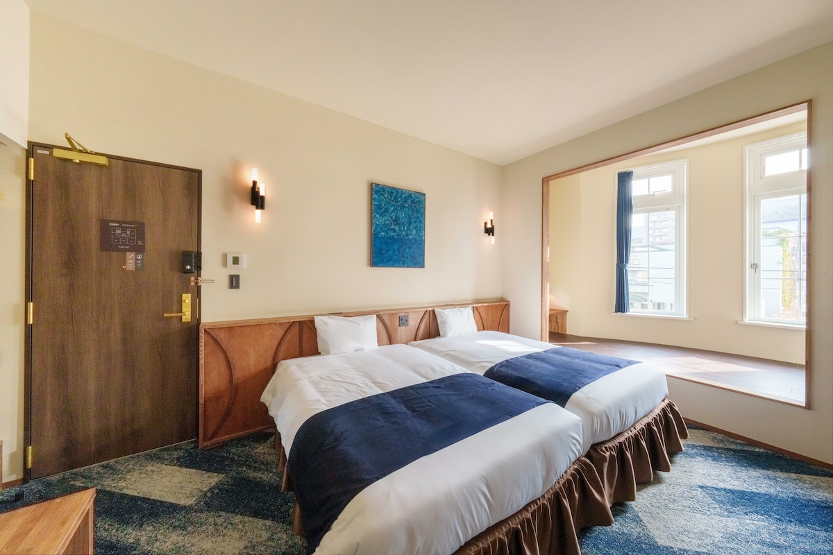 1920년, 장인의 손으로 지어진 목조 3층 건물. 한때 수산업 조합의 사무소로서 하코다테 항구를 지탱해온 이 건물이, 백 년의 세월을 넘어 「T9 HAKODATE」로 새롭게 태어났습니다. 가네모리 붉은 벽돌 창고까지 도보 3분, 역사적 건조물이 즐비한 스에히로초에 자리한 단 5개 객실만의 작은 헤리티지 호텔입니다. 다이쇼 시대의 숨결과 창문으로 스며드는 하코다테의 빛이, 여행의 설렘을 천천히 가라앉혀 줍니다. 5개의 객실은 각각 하코다테의 풍경과 역사를 테마로, 저마다 다른 이야기를 담고 있습니다. 그 중 하나가 「Gunjo-群青-」. 쓰가루 해협의 깊은 푸른빛과 하코다테가 자랑하는 야경을 떠올리게 하는 객실입니다. 세미더블 침대 2개·2명이 조용한 기품 속에서 여유롭게 지내실 수 있습니다. 이 도시의 밤은, 분명 잊지 못할 기억이 될 것입니다.