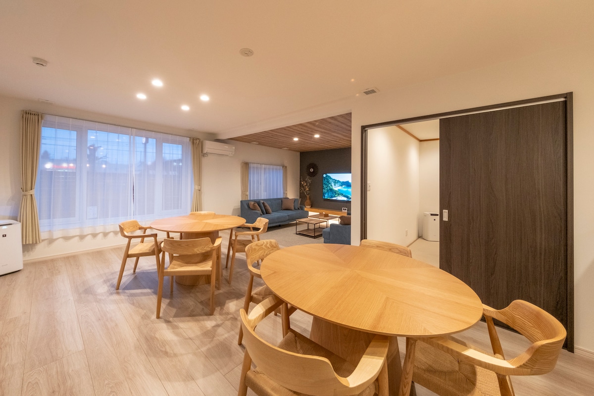 침실 5개와 넓은 거실이 있습니다. 세련되면서도 기능적 넉넉한 수납공간 덕분에 대규모 단체도 깔끔하게 숙박할 수 있습니다. 공용 및 전용 공간 공용 공간에서 함께 모이거나 나만의 방에서 휴식을 취하세요. 120인치 화면 프로젝터로 영화를 즐겨보세요. 슈퍼마켓이 근처에 있습니다. 가족이나 단체 여행에 적합합니다! 바비큐 및 전용 사우나. [옵션 세트: ¥24,000] * 거실에는 에어컨이 하나만 있습니다. (전기 선풍기가 여러 개 있습니다.) 각 객실마다 난방이 제공됩니다.