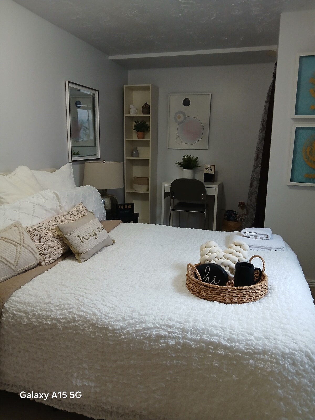 저희 숙소는 다음을 제공합니다. - 전용 출입구 및 간이 차고 주차 공간이 있는 전용 지하실 -자연광이 많이 들어오는 넓은 공간 -싱크대, 오븐 및 레인지, 토스터 오븐, 전자레인지, 믹서기, 커피/차, 조리 도구 등이 구비된 주방 - 바비큐 그릴, 화덕 및 커다란 그늘진 나무가 있는 넓은 울타리 마당 - 대형 스크린 4KTV 및 편안한 소파가 있는 가족 객실 - 원격 근무자를 위한 전용 사무 공간 - 침실 2개, 킹사이즈 침대 1개, 풀사이즈 침대 1개 -세탁기/건조기 및 욕실/샤워기가 있는 세탁실 -초고속 와이파이