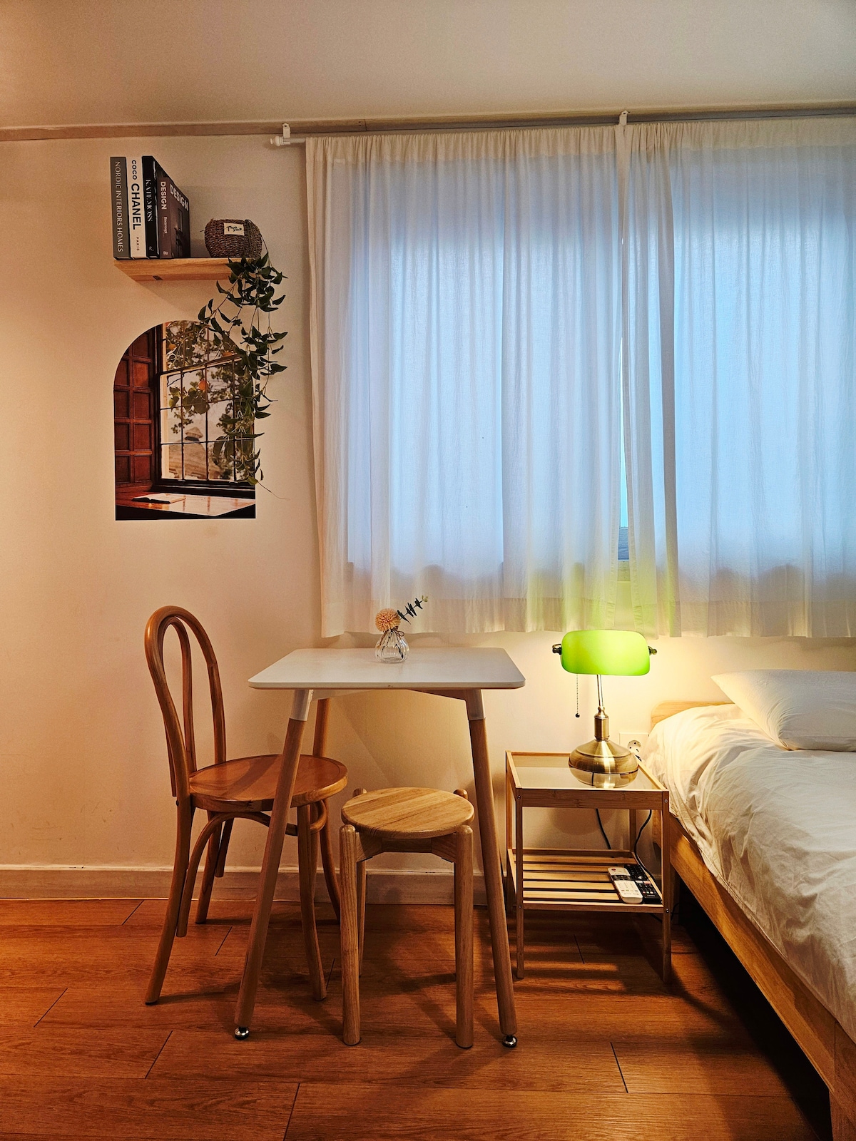 '겨울' 콘셉트 디자인 (모던, 깔끔), 3층, 테라스 전망 좋음 최근 리모델링한 건물로 호텔 수준의 침구류와 기타 환경을 갖추고 있습니다. 장기 숙박에 적합한 가성비 장점 이 객실은 1층에 편리하게 위치해 있으며 따뜻하고 안정적인 디자인을 갖추고 있으며 전망이 좋습니다. TV, 냉장고, 욕실, 화장대 (거울) 등 (특별공용생활장소) 세탁기, 건조기, 오븐, 생수, 등