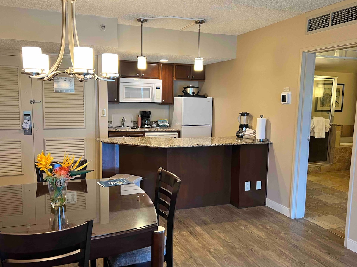 풀서비스 리조트의 모든 편의시설을 이용할 수 있는 전용 콘도에 머무르는 것은 어떨까요! 경치 좋은 전망은 바다 추가 요금으로 업그레이드되었습니다. 전용 수면 공간이 있는 거의 900피트 ² 를 즐기실 수 있습니다. 4명이 숙박할 수 있지만 5인용 객실입니다;) 킹 마스터 퀸사이즈 슬리퍼 소파 프리그와 냉동고 전자레인지/대류 커피메이커 토스터기 전기 프라이팬 식기세척기 믹서기 섬에서 유일하게 온수 욕조와 수영장이 있습니다.🛁 오일림픽 풀 슈퍼 슬라이드 배구 볼링장 퍼트 퍼트 골프
