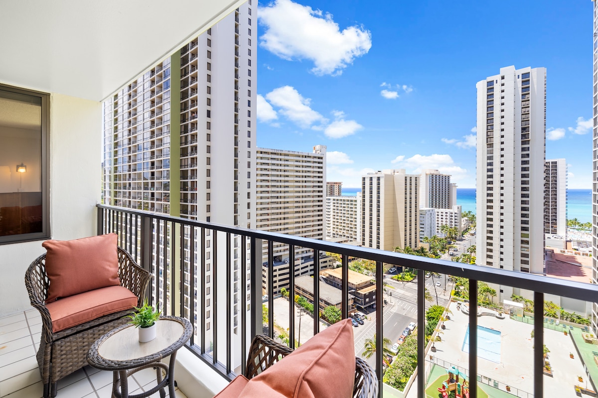 Enjoy a beautifully renovated studio suite on the 26th floor! Centrally located with just steps away from Waikiki Beach, International Market Place and the Royal Hawaiian Shopping Center. This GORGEOUS studio is fully furnished with 2 queen size beds, 65in HD4K smart TV, quiet split AC system and a large private patio overlooking the Waikiki Skyline. This stunning studio is perfect for couples, small groups and family travel! Welcome to your home away from home!~ Aloha!