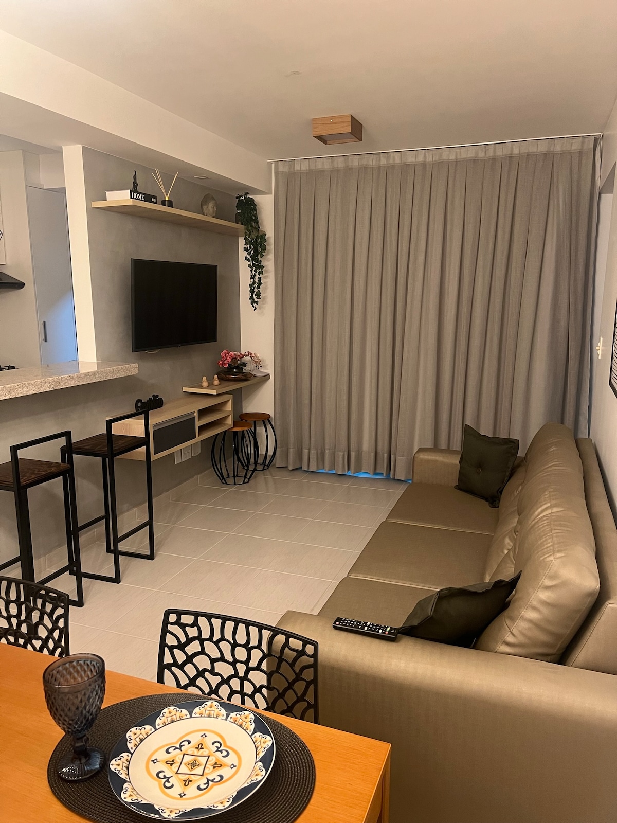 Bem localizado e seguro. É Rigorosamente higienizado c/ preservação da segurança e da privacidade das famílias. Apto 3 quartos, sendo 1 suíte c/ cama de casal, sala c/ cozinha americana, varanda c/ mesa, lavabo, 1 quarto com cama de casal, 1 quarto com 2 camas de solteiro, + 3 colchões extras , mesa de jantar com 6 cadeiras, sofá grande, ar condicionado nos 3 quartos, TV, fogão, geladeira, forno, mobília completa e área de lavanderia. Equipado p/ receber 9 pessoas (permitidos no condomínio)