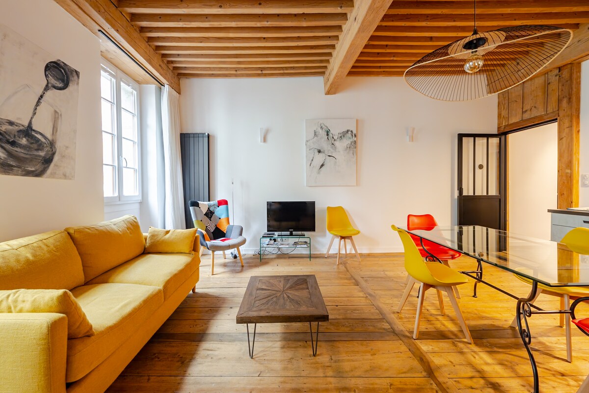 안시 중심부에 위치한 이 독특한 숙소는 30㎡(+ 16㎡ 중이층)의 거실 공간을 갖추고 있으며 매우 조용한 보행자 거리에 있어 역(도보 600m -8분)과 호수(도보 450m-6분)에서 모두 가깝습니다. 완전히 리모델링한 나무, 유리, 철제 소재는 안뜰 쪽의 햇살 가득한 테라스처럼 여러분을 매혹할 것입니다. 1인용 침대가 있는 중이층은 너무 어린 아이도 너무 나이 많은 어른도 아닌 세 번째 여행자를 수용할 수 있습니다(사다리).