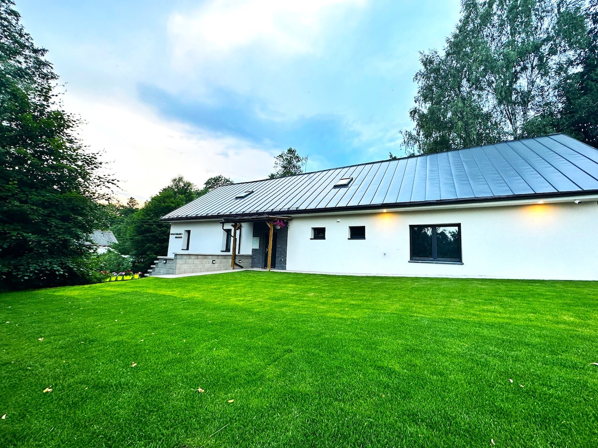 Welcome to Chalupa U Horníků, Vítkovice, for 22 guests! 😊 Free SAUNA, 5 cozy bedrooms with bathrooms, big social room with ping-pong, darts, couch by stove. Espresso (coffee’s on us! ☕). SUMMER: swimming pool, petanque, walks (or bus 800m take you to the top of the mountains). Trampoline, fire pit, WINTER: sledding, skiing Near: 2 km to Aldrov, Vítkovice Snowpark, 9 km to Horní Mísečky ski area. 🚗 parking for 7 cars Relax by the Jizera River with firewood heating to keep you cozy!