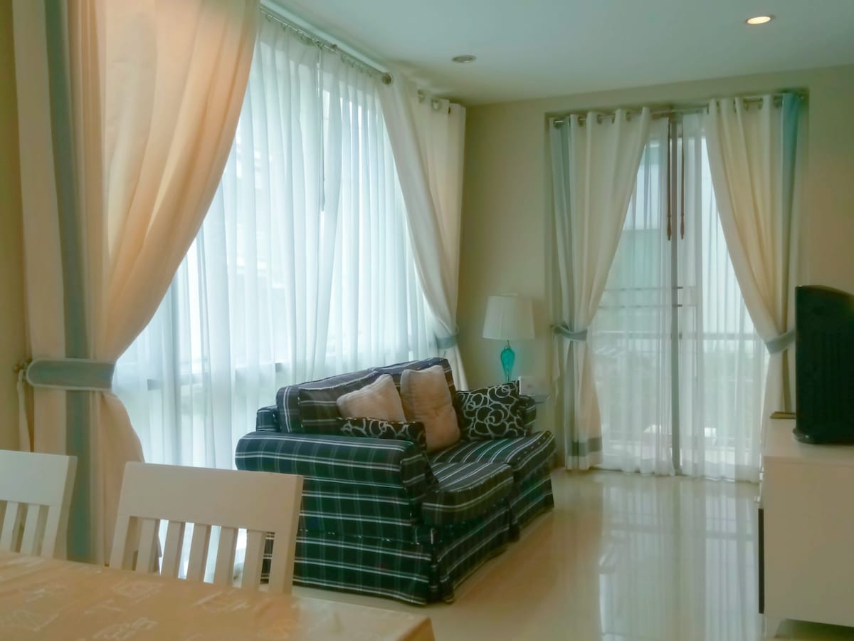 Hello! Welcome to Thailand and Hua Hin!:)You are very welcome to stay in this lovely and clean condo. We hope you’ll enjoy your stay and have fun in Hua Hin! - A designer style white color theme with a little turquoise, fresh and clean - A huge balcony with a marvelous view of green mountain and palm trees - Brand new furniture purchased April 2018 - A queen size bed with stylish night stands and lamps - A big white sofa set could seat 3-4 people. Sofas could be turned into two beds if needed. - 55 inch Samsung 4K Ultra HD smart TV set with built-in Netflix and Youtube app+ local TV channels - Free wifi - Free parking lot - Air-conditioner - Swimming pool downstairs(there are two pools not only one) - Fitness room downstairs - Laundry could be sent to downstairs’ management office to be cleaned for a very small charge - A Restaurant and a Coffee shop and a 24-hour small convenience store on 2nd floor in the condo building - All equipped Kitchen with Siemens refrigerator, induction stove, microwave oven, electric water boiler, toaster, rice cooker with cooking utensils and tableware. - 2 Bath towels and 2 hand towels will be prepared each time before check-in - Hair dryer, shampoo and bath shower are included - In a gated community with 2 safety guards 24hours on duty - Located in downtown Hua Hin and on famous Phethasem Road which is a main road here - 2 minutes to a local grocery store - 3 minutes to 7-11 24hour-convenience store - 5 minutes walk to night market and Chatchai market - 6 minutes to the bus station where Bangkok-Hua Hin bus - 7 minutes walk to the beautiful beach and you could enjoy Cabana at the Oceanside restaurant which we recommend very much and very close Hilton hotel - You will find that living in our house is as convenient as to live in your own house. - With 10 Baht (0.15US dollars), you could take a mini bus right in front of to reach any shops and supermarkets, such as the Bluport, Market village, Makro Food Center, etc. You are very welcome to live in our place and enjoy your stay in Hua Hin! We hire professional cleaners to clean the place thoroughly each time before you check in and make sure the beddings and towels are changed to fresh and clean ones. We’ll not be in town when you are visiting but we have a management office downstairs which could help you and you could also contact us any time when you have any questions during your stay. We hope to host you very well.