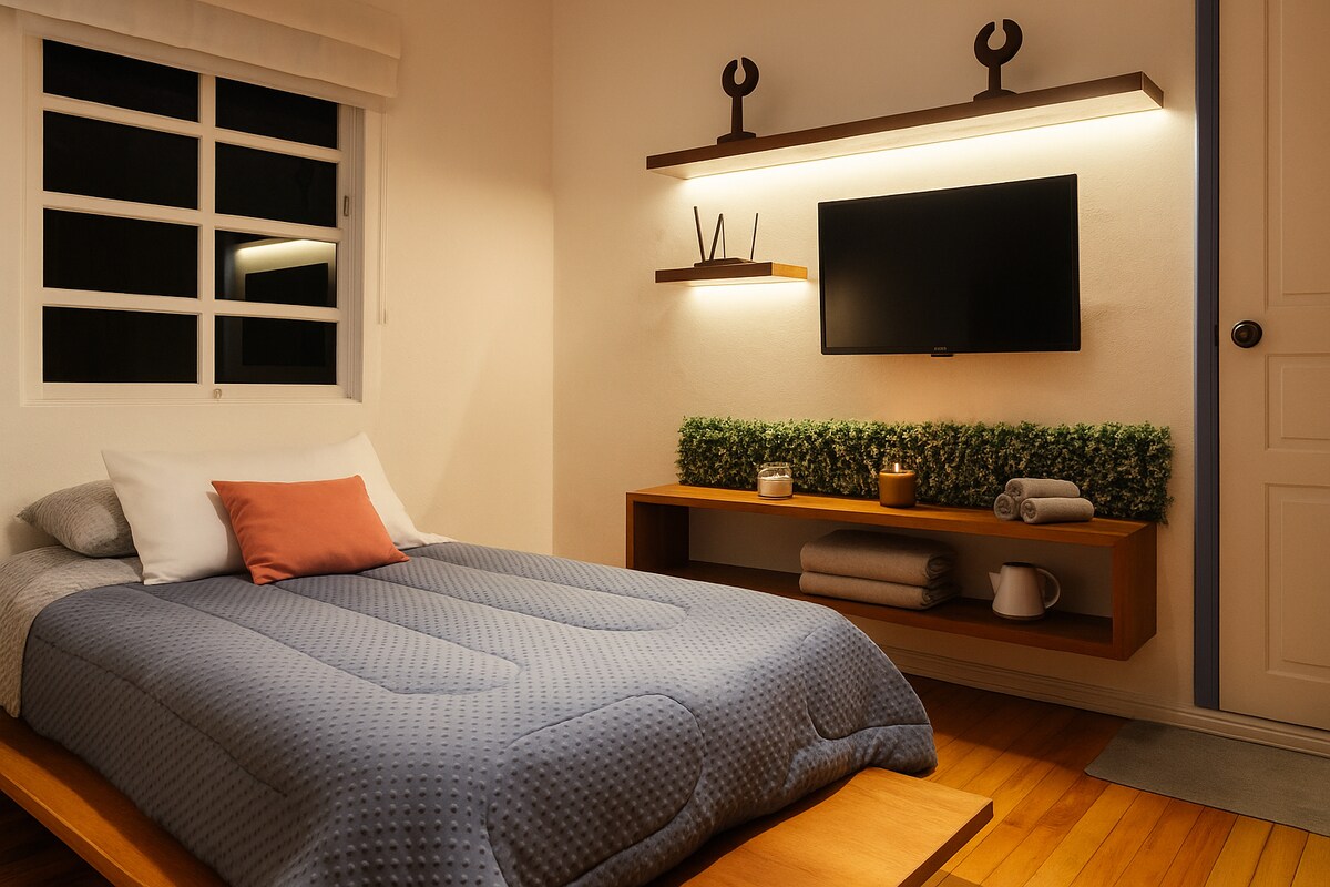 기능성과 휴식을 위해 세심하게 설계된 미니 스위트에서 편안하고 우아한 숙박을 즐겨보세요. 2.5인용 침대, 3번째 사람을 위한 추가 슬라이딩 매트리스, 현대적인 전용 욕실이 있습니다. 숙소의 구조로 공간을 최대한 활용할 수 있으며, 넓고 편안하며 아늑한 분위기를 제공합니다. 숙박 기간에 좋은 취향, 청결도, 평온함을 중시하는 여행객에게 이상적입니다.