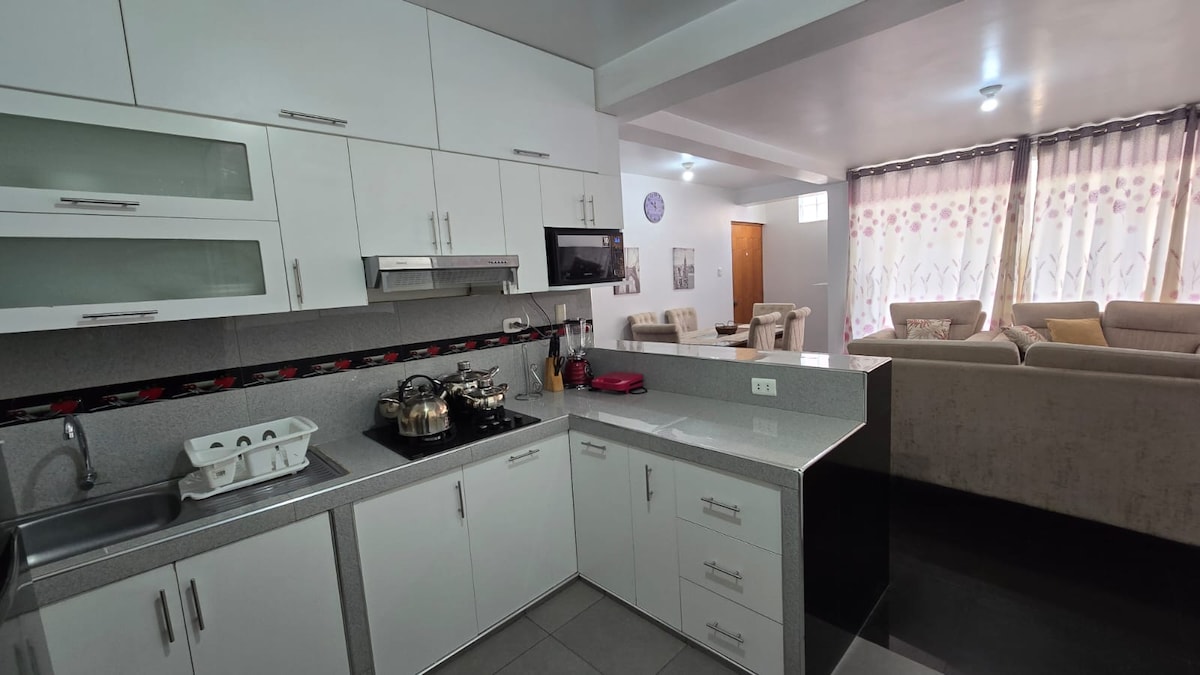 Disfruta de este alojamiento acogedor y céntrico. El apartamento es de 120 m2, tiene 03 habitaciones y 02 baños con agua caliente y una terraza con hermosa vista a la ciudad, ofrecemos cocina, freezer, sala de comedor, muebles, TV smart, teléfono y WIFI a alta velocidad. No contamos con ascensor y se ubica en el 5to piso de un hotel. La limpieza se realizará sin costo alguno, mínimo una semana de estadía. IMPORTANTE SE RESERVA CON LA CANTIDAD DE HUÉSPED, POR FAVOR LEAN YEVITARSE PROBLEMAS.