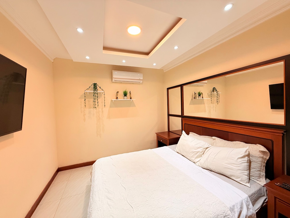 Disfruta de esta habitación 100% independiente en el primer piso, con acceso directo desde la calle y vista a la calle. Ideal para 1 o 2 personas, es cómoda, limpia, segura y acogedora, con cama de dos plazas, baño completo privado, aire acondicionado, Smart TV 32” con cable y wifi, además de acceso al 5º piso con lavandería. Ubicada a 10 min del centro y aeropuerto, 30 min de playas y 25 min de manglares.