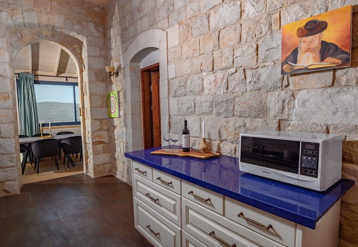 멋진 넓은 거실 디자이너 화강암 조리대, 스토브, 빌트인 오븐, 냉장고, 샤바트 핫플레이트 및 항아리 등 완비된 현대적인 개방형 주방이 완비된 현대적인 개방형 주방 갈릴리의 멋진 언덕의 숨 막히는 파노라마 전망을 내려다볼 수 있는 커다란 베란다 편안한 침대가 있는 넓은 침실 4개 욕실 3개: 마스터 베드룸의 욕실 1개 높은 청소 기준에는 중앙 에어컨이 포함되어 있습니다. 세탁기/건조기 모든 침구 및 수건, 샴푸, 비누, 커피, 차, 설탕