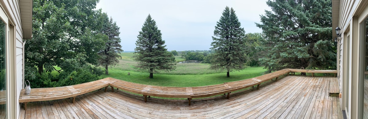 55에이커에 자리한 이 놀라운 리모델링 숙소에서는 성숙한 나무와 커다란 연못이 내려다보입니다. 숙소에는 침실 3개와 욕실 1.5개가 있습니다. 세탁도 이용하실 수 있습니다. 주방에는 요리를 즐길 수 있도록 완비되어 있으며 가스 그릴도 제공됩니다. 가족, 소규모 단체 또는 출장에 적합한 숙소입니다. 데스모인 공항에서 불과 20분, 데스모인 시내에서 25분 거리에 위치하여 조용하고 아름다운 풍경을 즐길 수 있습니다.