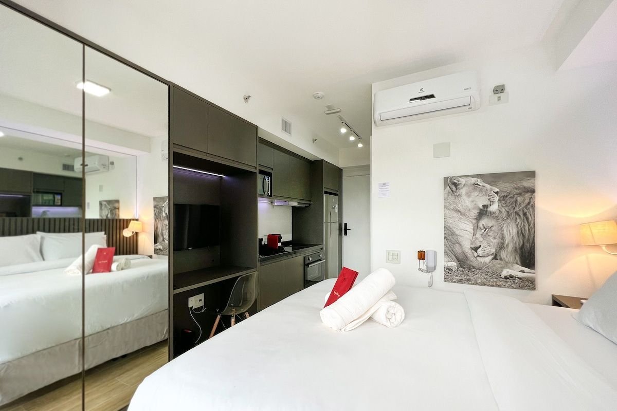 빌라 노바 콘세이사오의 최고 지점에 있는 스튜디오. 주방용품(네스프레소, 전자레인지, 쿡탑, 복고풍 냉장고)이 완비되어 있습니다. 스마트 TV, 에어컨. 침구 세트, 이불, 이불, 수건. 식탁/업무용 테이블. 빛이 잘 드는 통풍이 잘 되는 베란다. 옷장. 셀프 체크인. 자율 시장, 피트니스 공간, 자쿠지, 바비큐, 야외 미식 공간. 레스토랑이 가득한 동네. 이비라푸에라 공원 근처, 병원. 빌라 노바 스타