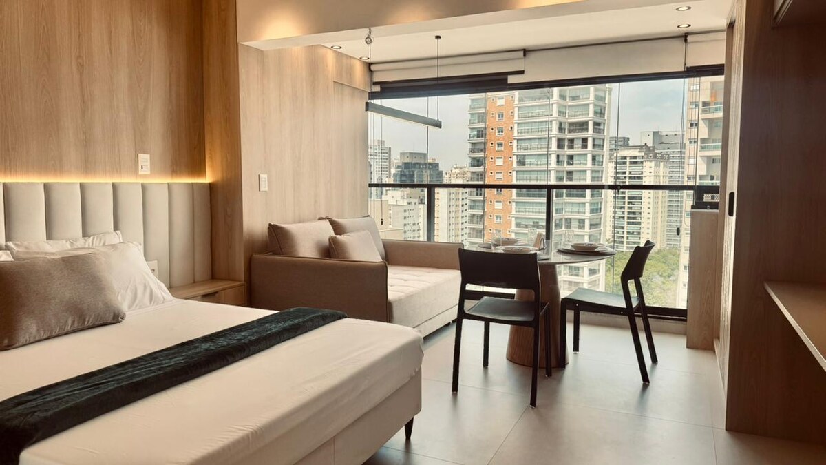 Relax in the best location of São Paulo, between Jardins and Pinheiros. This newly opened studio is a 5-minute walk to the Oscar Freire subway station, in a new building with all the infrastructure for a quiet and comfortable stay. It is on top of a bakery with artisan bread and across the street from a supermarket. The building has coworking and coliving space, laundry room, gym, rooftop pool, and a 24-hour doorkeeper. Wi-Fi 450Mbps.