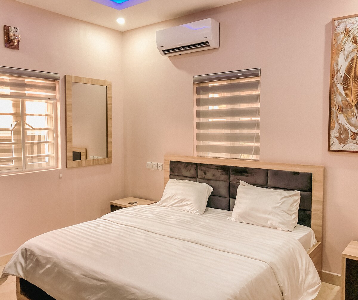 넓은 객실을 갖춘 이그제큐티브 스탠다드 숙소로 넓은 거실, 초고속 무제한 와이파이, 각 침실에는 43인치 스마트 TV, 거실에는 55인치 스마트 TV, 유튜브, 넷플릭스 DSTV 및 풀 스카이 패키지, 화재 경보기, 냉장고, 물 주전자, 온수기, 옷장, 최고의 보안을 갖춘 24시간 전기 등이 갖춰져 있습니다.