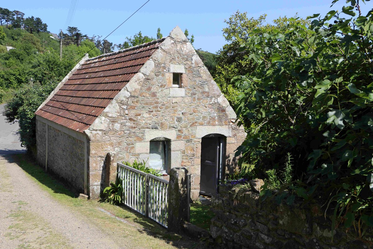 Small traditional granite house, with garden and direct access to the beach. Located on a remarkable site opposite the island of Aval, in a quiet and wooded environment, 3 minutes by car from all shops.