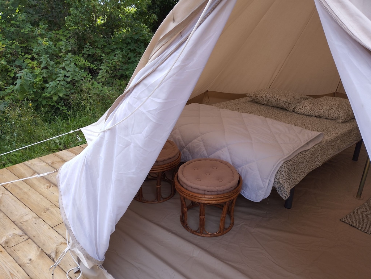 Hébergement 3/4 personnes, en tente nomade pour une expérience de camping avec facilité, confort et style. 12 m² au sol, 250 cm de hauteur, 2 lits 120 et 140. Petite serre sur terrasse pour l'espace repas abrité. Se connecter à la nature, randonnées à pied, à vélo, pêche... Découverte des argiles médicinales : bain d'argile corps entier à 40° du printemps à l'automne (40€) et différents soins toute l'année sous réserve de ma disponibilité. Petit déjeuner bio classique ou végan sur demande 7€.
