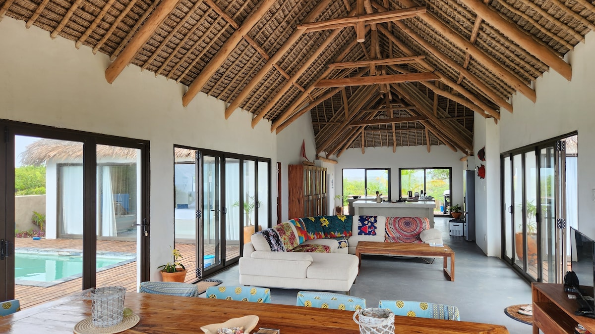 4x4로 접근할 수 있는 전원풍의 매력을 자랑하는 쾌적한 전원주택으로 천상의 전망을 감상할 수 있습니다. 야자수가 늘어선 모래 언덕에 있는 커플을 위한 넓고 잘 꾸며진 숙소로 바라 해변의 최고의 전망을 자랑합니다. 아침 식사 테이블에서 아이언우드 의자에 앉아 있거나 제빙기에서 얻은 얼음이 담긴 차가운 음료를 마시며 바라 해변 바로 앞의 암초, 현지 어선들, 안개 속으로 뻗어 있는 모잠비크 북부 해안을 바라보세요. 편안한 침대에서 이 전망에 감탄하세요. 베란다 앞 해변 모래사장에서 별을 감상하세요.