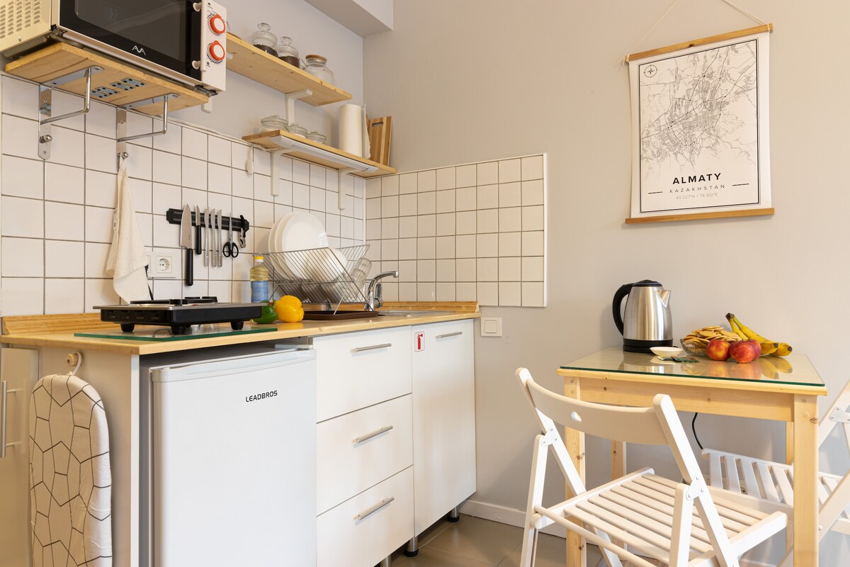 A stylish modern flat is a great option for leisure and business trips. Located in the center of Almaty, 100 m from Abaya Street. Nearby are the circus, the Sports Palace, the Republic Palace, the central stadium, the cable car, Lermontov Theater, Mukhtar Auezov Theater. The studio is fully equipped for 2 people: a sofa, a double bed, a kitchen area with necessary appliances, a bathroom, a large TV and high-speed WiFi. Windows with mountain views and a quiet courtyard.