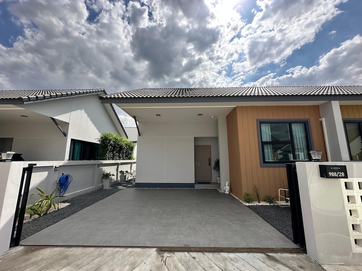 Stylish House Near the International Circuit This modern house is ideally located near Chang Arena (4.2 km), Chang Circuit Buriram (5.9 km), and Big C (1.5 km). The house: - Two high-quality bedrooms with comfortable queen-size beds - Two bathrooms - A living room - A fully equipped kitchen with a washing machine - 500 Mbps Wi-Fi and cable TV - Complimentary coffee and drinking water The two bedrooms are located on the SECOND floor, while downstairs you will find the living room and kitchen