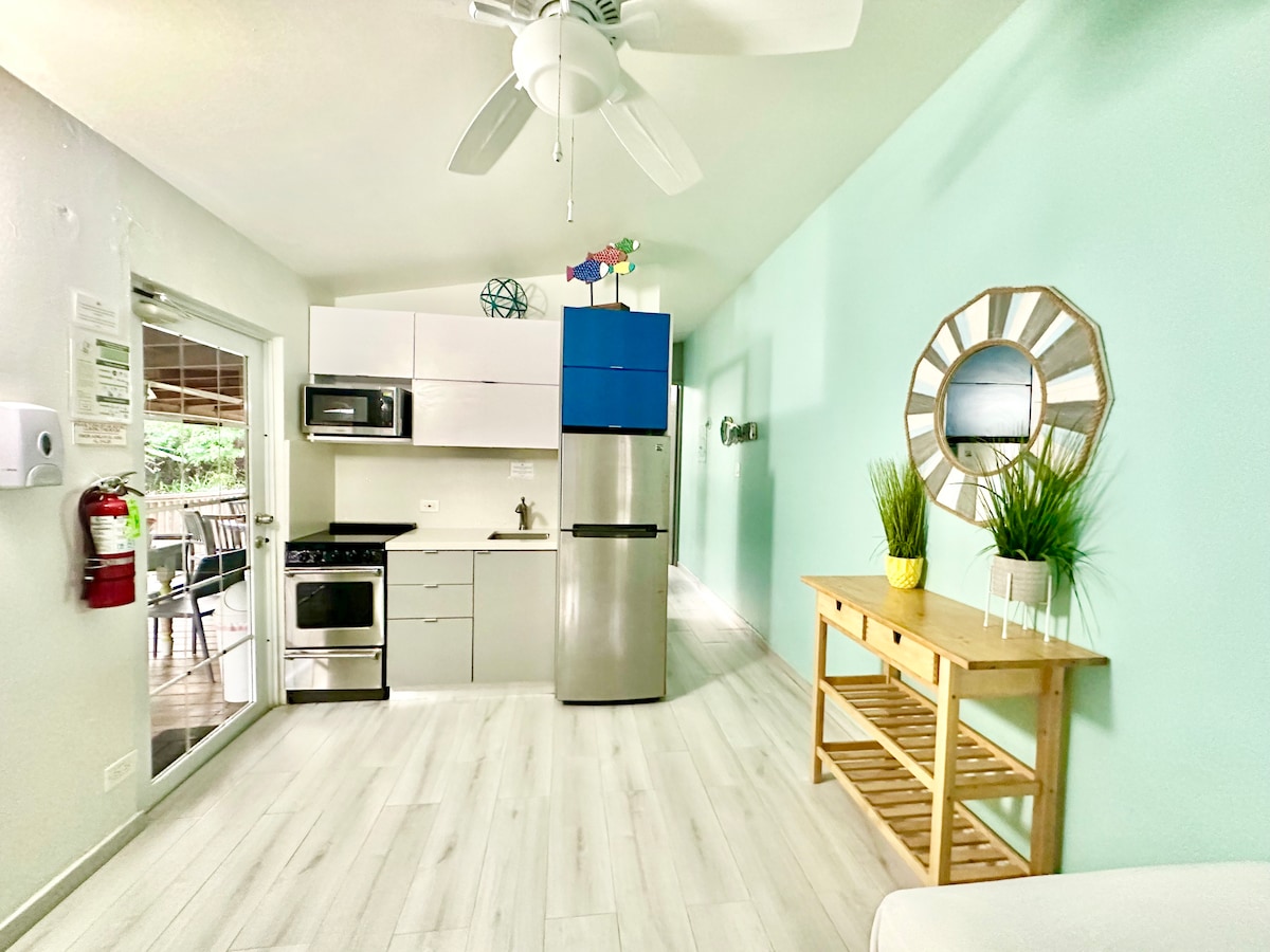체크인: 오후 3시 체크아웃: 오전 11시. 50달러 조기/늦은 체크인 킹사이즈 침대, 이층 침대, 소파 베드를 갖춘 최대 5명의 게스트를 위한 대형 에어컨이 설치된 이피션시 아파트입니다. 시작 요금은 게스트 2명당 $ 110이며, 추가 게스트당 $ 20가 최대 5명까지 인상됩니다. 욕조, 커피메이커가 있는 간이 주방, 토스터 오븐, 핫플레이트, 냉장고, 전자레인지, 와이파이, 넷플릭스 TV, 식기, 파티오, 석탄 그릴, 전용 출입구. 게스트는 비치 의자, 쿨러, 추가 야외 샤워 시설을 이용할 수 있습니다.