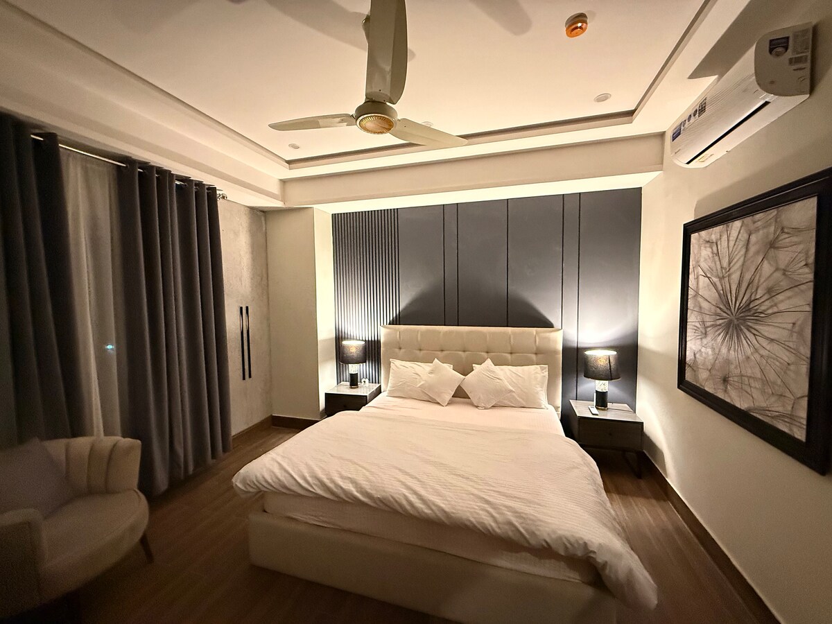 Luxury 2BHK in SkyPark One | Designer Living with Breathtaking Views Step into comfort in this spacious designer apartment overlooking Islamabad’s serene hills. Enjoy 2 king beds, private balconies, 65" Smart TV, ultra high-speed WiFi and full kitchen. Located above SkyPark One Food Court, 2 mins from Expressway. Perfect for families or business travellers. Modern decor, smart locks, inverter ACs & hot water ensure a cozy stay. CNIC required for guests 18+. No smoking or parties. Book now!