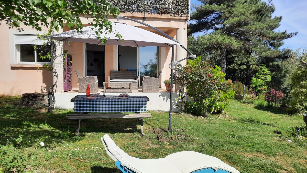 Appartement calme situé au rez de chaussée de notre maison. Entrée independante. Climatisé, grand salon avec cuisine ouverte équipée, vous y trouverez la base pour cuisiner (huile/sel/poivre...).Grande salle de bain avec douche à l'italienne (draps de bain fournis). 2 grandes chambres avec avec 1 lit en 1 60. Linge de maison fournis. Terrasse extérieure couverte avec barbecue; accès à la piscine et au jardin. Nous vous réservons l'accès à la piscine lorsque vous êtes presents.