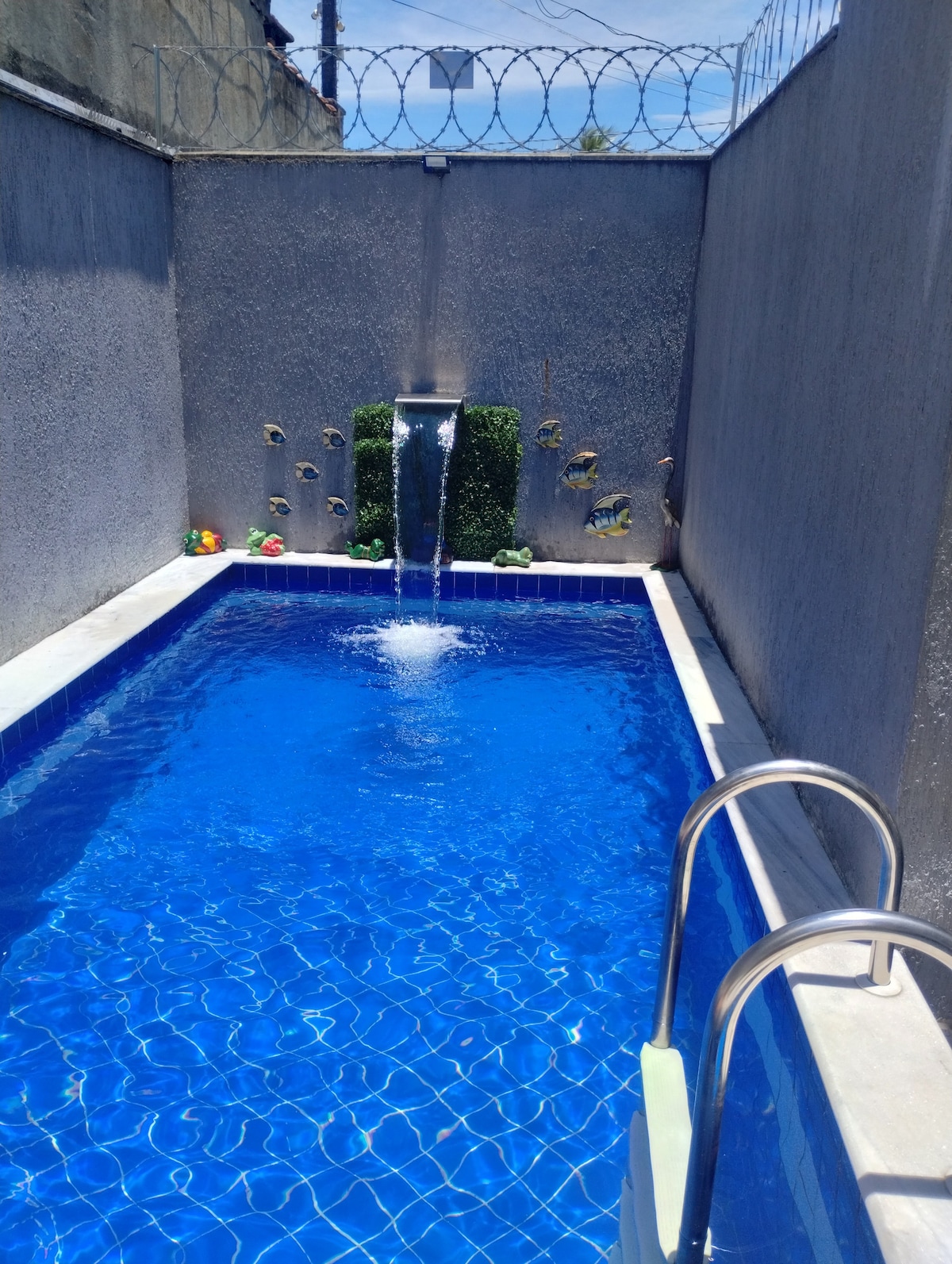 해변에서 700m 떨어진 아름다운 숙소로 2개의 침실이 있으며 1개는 스위트룸이고 두 번째 침실에는 더블 및 싱글 매트리스 2개가 있습니다. 걱정할 필요가 없는 완비된 주방/스마트 TV가 있는 거실에서 귀하의 계정으로 유튜브와 넷플릭스를 즐길 수 있습니다. 거실과 두 개의 침실에 천장형 선풍기가 설치되어 있어 항상 시원합니다. 욕실, 수영장에는 아름다운 폭포가 있습니다. 램프가 있는 바비큐 시설, 차량 4대용 차고, 콘서티나 벽, 보안 카메라 및 무료 와이파이가 있습니다.