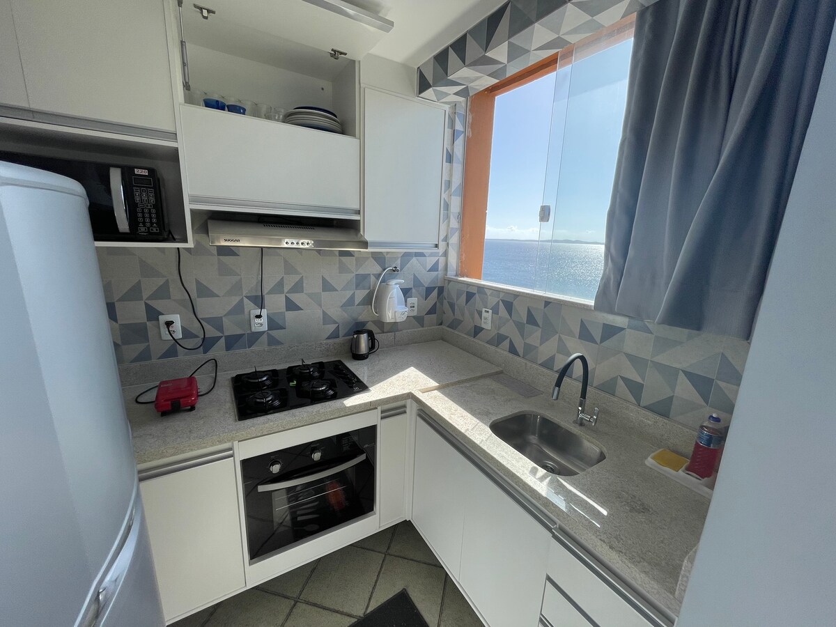 A vista incrível para a Bahia de Todos os Santos, com a sensação de um pôr-do-sol exclusivamente seu! O apartamento encontra-se em excelente localização, em Salvador, com fácil acesso ao centro da cidade e principais pontos turísticos. Mercado Modelo, Elevador Lacerda, Centro Histórico e museus. Nosso imóvel possui cozinha completa (fogão com forno, geladeira, pratos, panelas, talheres, etc.), ar-condicionado, ventilador, Smart TV. Possui 1 quarto com cama de casal e um sofá-cama.