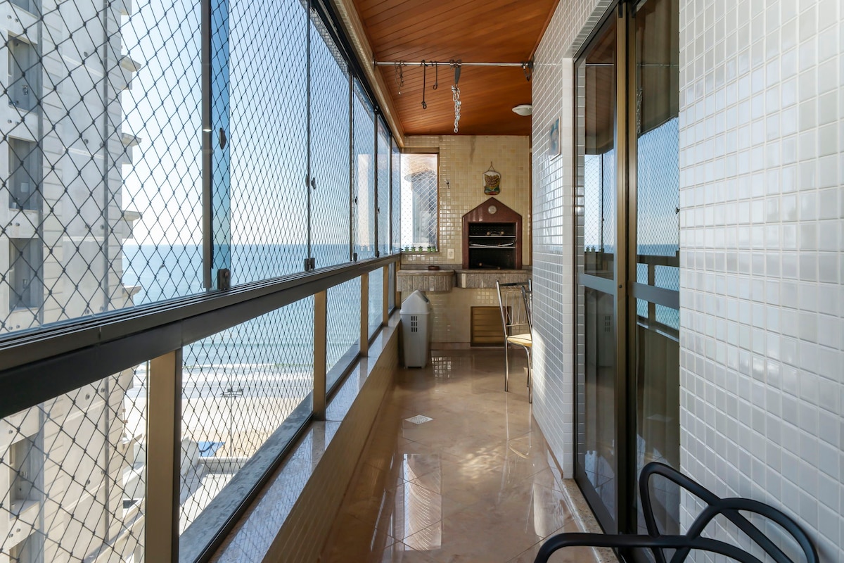 Apartamento de frente para o mar com três quartos, sendo: Uma suíte frente mar com cama queen size, ar-condicionado e sacada; Um quarto frente mar com cama de casal e ar-condicionado; Um quarto com cama de casal e ventilador. Banheiro social. Área de churrasqueira de frente para o mar. Sala climatizada com tv 4k smart 55", cervejeira, sofá retrátil. Cozinha equipada e conjugada com a sala. Wi-fi. Uma vaga de estacionamento.