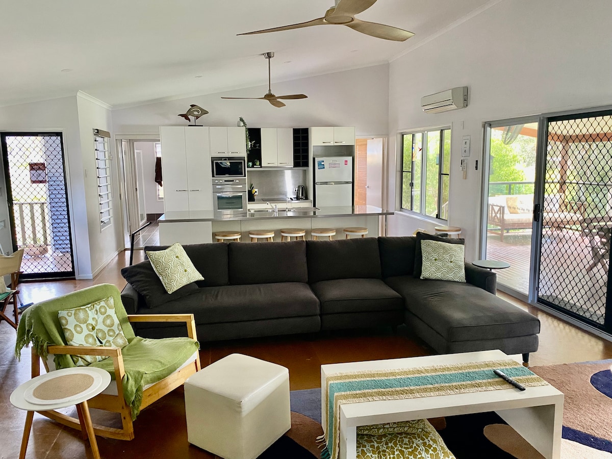 퀸즐랜더 스플릿 레벨 하우스는 글래드스톤 한복판에 위치하고 있으며, 부시랜드와 인접해 있고 상점에서 5분도 채 걸리지 않습니다. 저희는 위층에 살고 있으며, 아래쪽 절반은 주방/라운지, 마스터 침실, 전용 욕실 및 '비치 룸'(두 번째 침실)이 있는 독립형 숙소입니다. 4개의 객실은 모두 인접해 있으며, 외부에서 오는 경우를 제외하고는 사용 시 실내 통로가 없습니다. 비치 룸은 숙박 기간 동안 단독으로 사용할 수 있는 부시랜드 전망과 수영장을 자랑합니다.