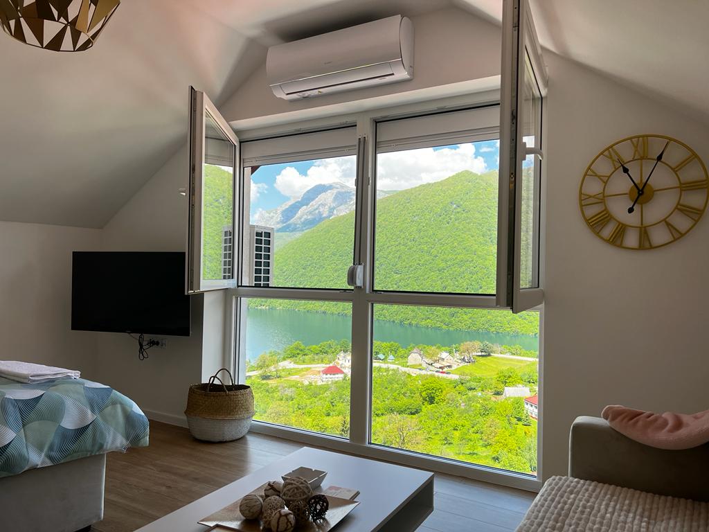 Shic, stylish, sparkling clean and cozy 2-bedroom apartment with fully-equipped kitchen and balcony. Located in the quiet area with gorgeous views. Here you can plunge into the peace and serenity being surrounded by modern comfort. This bright and sunny apartment overlooks Piva Lake, crystal clear lake and majestic mountains (just from your bedroom!). The apartment is centrally located, few minutes from the bus stop, shops and cafes. Newly renovated with love to make your stay memorable!