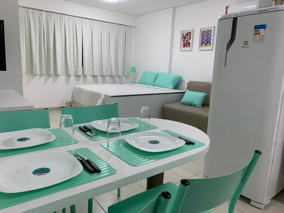 Flat aconchegante no 12º andar, com cama e ar-condicionado novos, garantindo o conforto que você merece, em um empreendimento com vários recursos, internet de utra-velocidade (500 MB) privativa, SmartTV de 43", ótima localização próximo a shoppings, supermercados, bares, restaurantes, centros empresariais, além da praia.