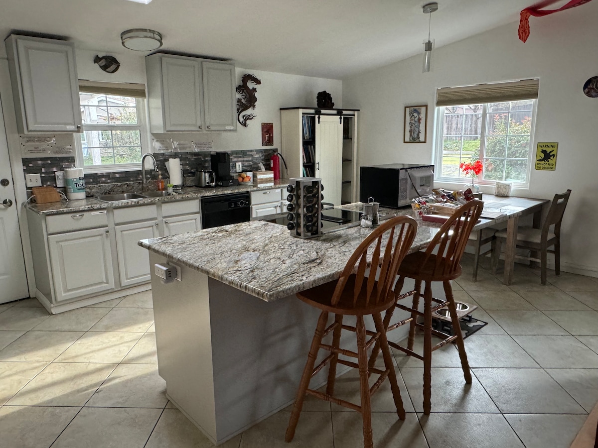 Nestled on the border of the Shakespeare hamlet of Ashland, Oregon, is Kelly’s farm. Only four miles away from Ashland. Kelly’s farm has horses, goats, chickens, gardens, fruit and nut trees with views of Mt. Ashland’s seven-thousand feet high profile in its front and bucolic rolling hills in its back. Bring your dog! You have access to a large fenced in yard right from your private entrance and deck. ***Unfortunately we are not set up for children under 4 or kitty cats.