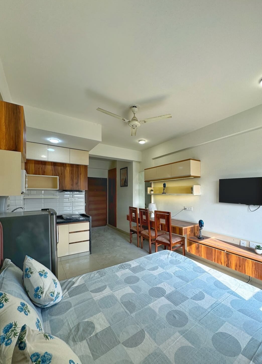 Welcome to Minimint – a stylish studio in a prime central location, perfect for exploring the city. Enjoy stunning sunset views from the standing balcony, relax on the comfy sofa-cum-bed, and stream your favorites on the smart TV with fast Wi-Fi. The modern kitchenette is fully equipped for small meals. Ideal for couples/solos - this compact space is filled with natural light and designed for both work and rest. Experience the best of city living—comfort, convenience, and charm—all in one place