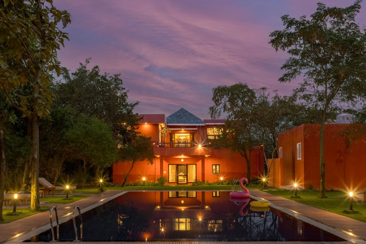 핑크 시티에 위치한 이 2-BHK 휴양지는 여러분과 털이 많은 친구들에게 이상적인 휴양지입니다!채광창이 어우러진 멋진 언덕 전망을 감상할 수 있는 아치형 창문으로 장식된 실내 수영장에 몸을 담그세요. 소파와 TV가 완비된 거실 공간은 주방과 식사 공간에서 몇 걸음 거리에 있습니다. 발코니에서 차 한 잔과 함께 하루를 시작하거나 울창한 정원에서 반려동물과 함께 즐거운 시간을 보내세요. '아티티 데보 바바 (Atithi Devo Bhava)' 를 전담하는 5성급 호스피탈리티 팀의 탁월한 서비스를 즐겨보세요.