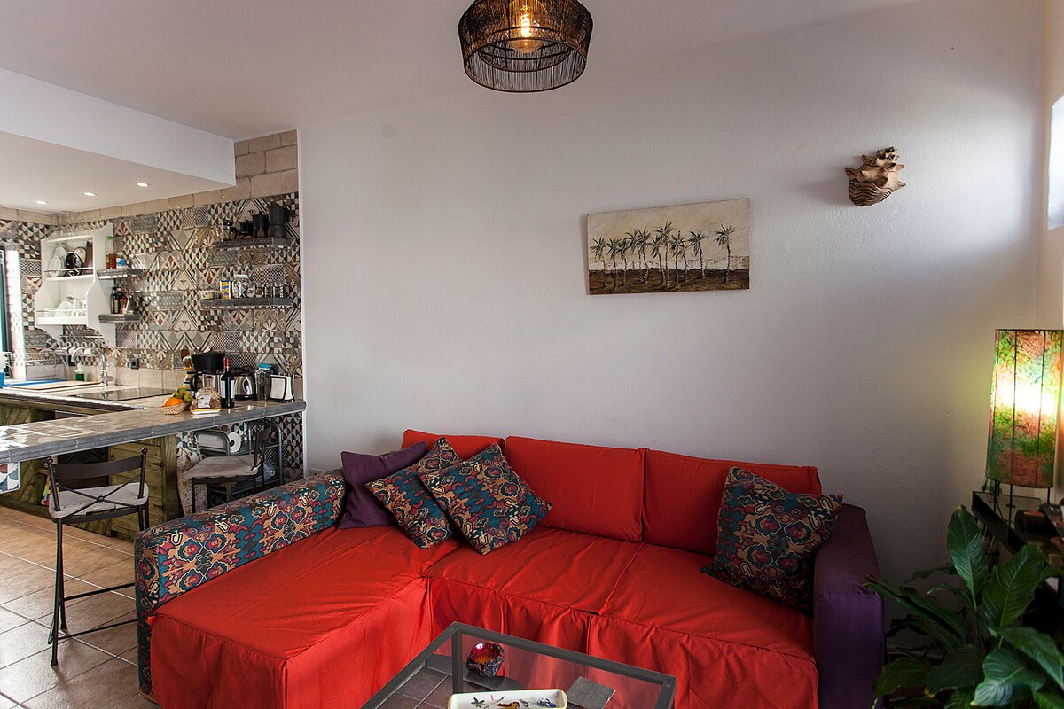 바다가 당신의 문앞에 있습니다. 카말루는 바다 앞에 위치한 아늑한 스튜디오로, 섬 북부의 특별한 코너에서 평화로움과 친밀감을 즐기기에 이상적인 장소입니다. 작은 바위 해변 앞에 위치한 아리에타 마을에 위치한 이곳은 사랑스럽게 설계되었으며 편안함을 느끼실 수 있도록 모든 편의시설을 갖추고 있습니다. 마을의 메인 거리와 서비스에서 도보로 2분, 라 가리타 해변에서 도보로 10분 거리에 있습니다.