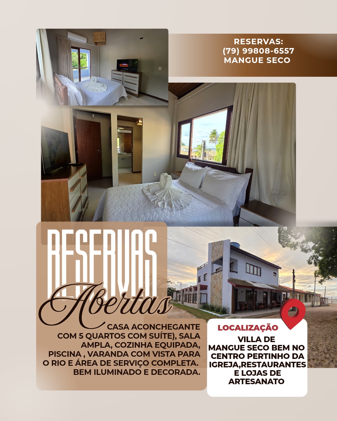 A Casa Rosa oferece 5 suítes com entradas independentes, ar-condicionado e chuveiros com aquecedor. Ideal para famílias grandes ou grupo de amigos, possui piscina privativa, área gourmet com churrasqueira e vista para o Rio Real. Localizada no condomínio privado Rio Real, fica perto das praias de Mangue Seco e Praia do Saco. Conforto, privacidade e natureza em um só lugar.