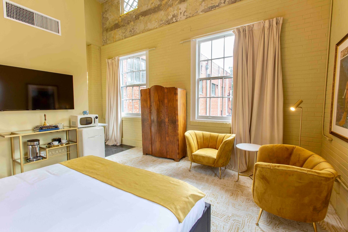 골든 아워 스위트에 머물며 아르데코 디자인 시대의 매력에 흠뻑 빠져보세요. 기존 건축적 특징과 구조적 요소를 활용하여 진정한 몰입감을 선사하는 객실입니다. 이 공간은 변형되었으며, 건물의 역사에 경의를 표하면서 현대적인 여행자들이 즐길 수 있는 모든 것을 더했습니다. 아늑한 좌석 공간, 벨벳 헤드보드, 킹사이즈 오가닉 메모리폼 매트리스, 스마트TV, 커피 스테이션, 미니 냉장고, 전자레인지가 완비되어 있습니다.