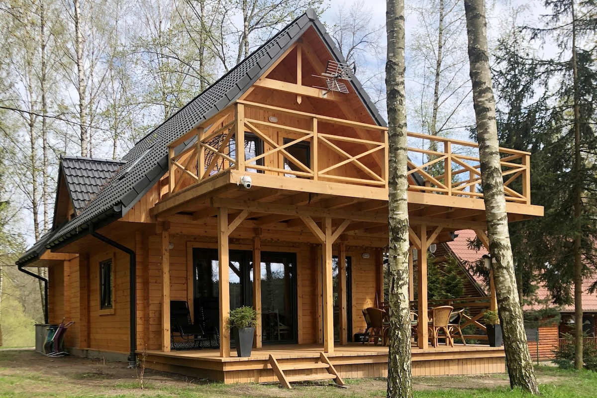 Cosy wooden house with private beach, jetty, rowing boat and fantastic view of the lake and surrounding trees. Finished to a high standard, 2 bathrooms, 4 bedrooms, living room with fireplace, fully equipped kitchen and large terrace, all designed having comfort and satisfaction of our guests in mind. On the fenced plot around the house, apart from a bonfire place with handmade benches and comfortable hammocks, you can find a lot of green space enabling all kinds of family recreation and relax.